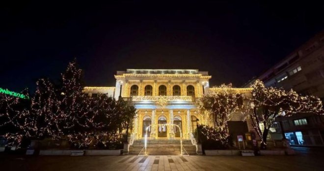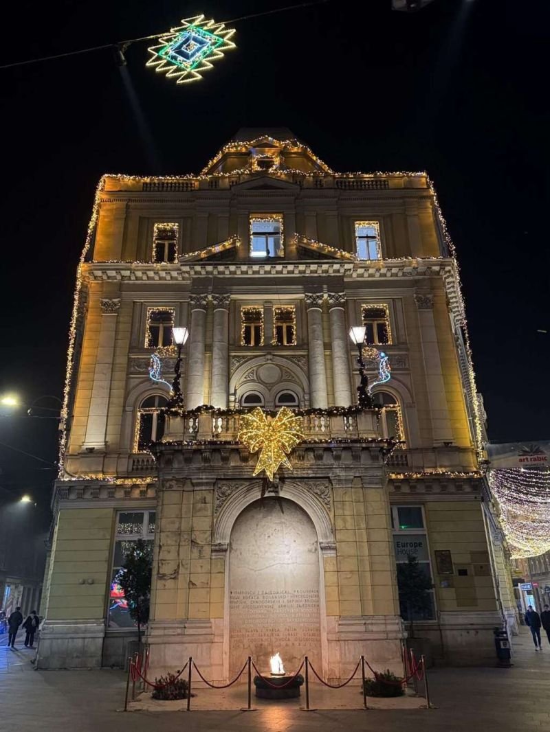 U svečarskom duhu sinoć su zasjali i prepoznatljivi graditeljski simboli Sarajeva: zgrada Vječne vatre, te zgrada Narodnog pozorišta, sa dijelom Pozorišnog trga Susan Sontag.